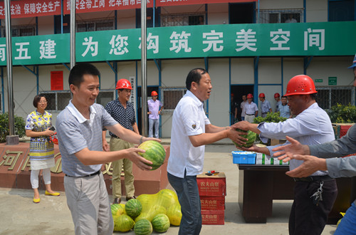 盛夏驕陽似火,酷熱難耐,持續(xù)的高溫籠罩著信陽大地,但在炎炎烈日下,公司各項目一線員工依然堅守崗位。近日,信陽市住建局局長孫麗平及工作人員帶著礦泉水、西瓜、毛巾等防暑降溫物品來到公司東方今典D地塊項目部,慰問堅持奮戰(zhàn)在高溫第一線的員工,在炎熱的夏日為他們送去絲絲清涼。
