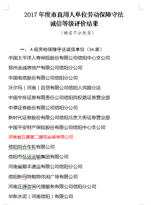 近日,信陽市人力資源和社會(huì)保障局公布了《關(guān)于2017年度市直用人單位勞動(dòng)保障守法誠信等級(jí)評(píng)價(jià)結(jié)果的公示》,我公司被評(píng)為A級(jí)勞動(dòng)保障守法誠信企業(yè),這是公司連續(xù)多年獲評(píng)這一榮譽(yù),也是信陽市唯一一家建筑施工企業(yè)獲此殊榮。