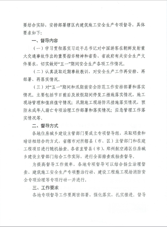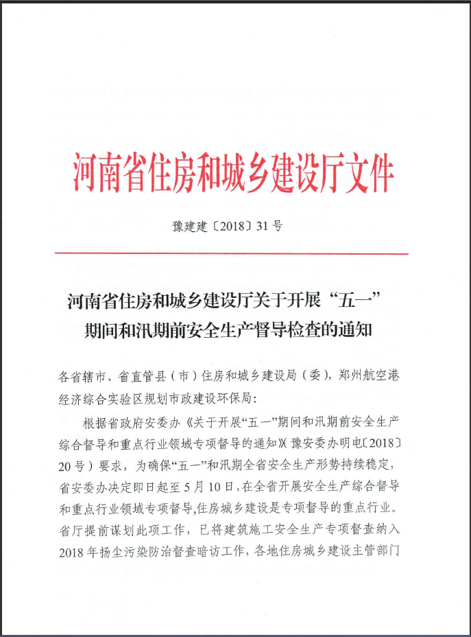 河南省住房和城鄉(xiāng)建設(shè)廳關(guān)于開展“五一”期間和汛期前安全生產(chǎn)督導(dǎo)檢查的通知