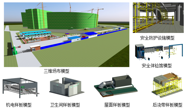 2、三維場布模型施工現(xiàn)場平面布置三維場布建模采用Revit軟件創(chuàng)建,分為:現(xiàn)場布置三維場布模型、后澆帶樣板模型、衛(wèi)生間樣板模型、屋面樣板模型、機(jī)電樣板模型、安全體驗館樣板模型、安全防護(hù)設(shè)施模型(圖3)。