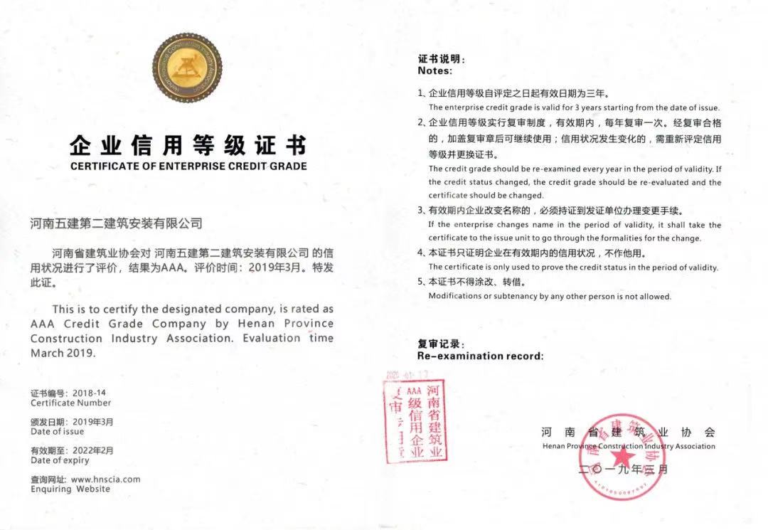 河南省建筑業(yè)協(xié)會(huì)AAA級(jí)信用等級(jí)證書