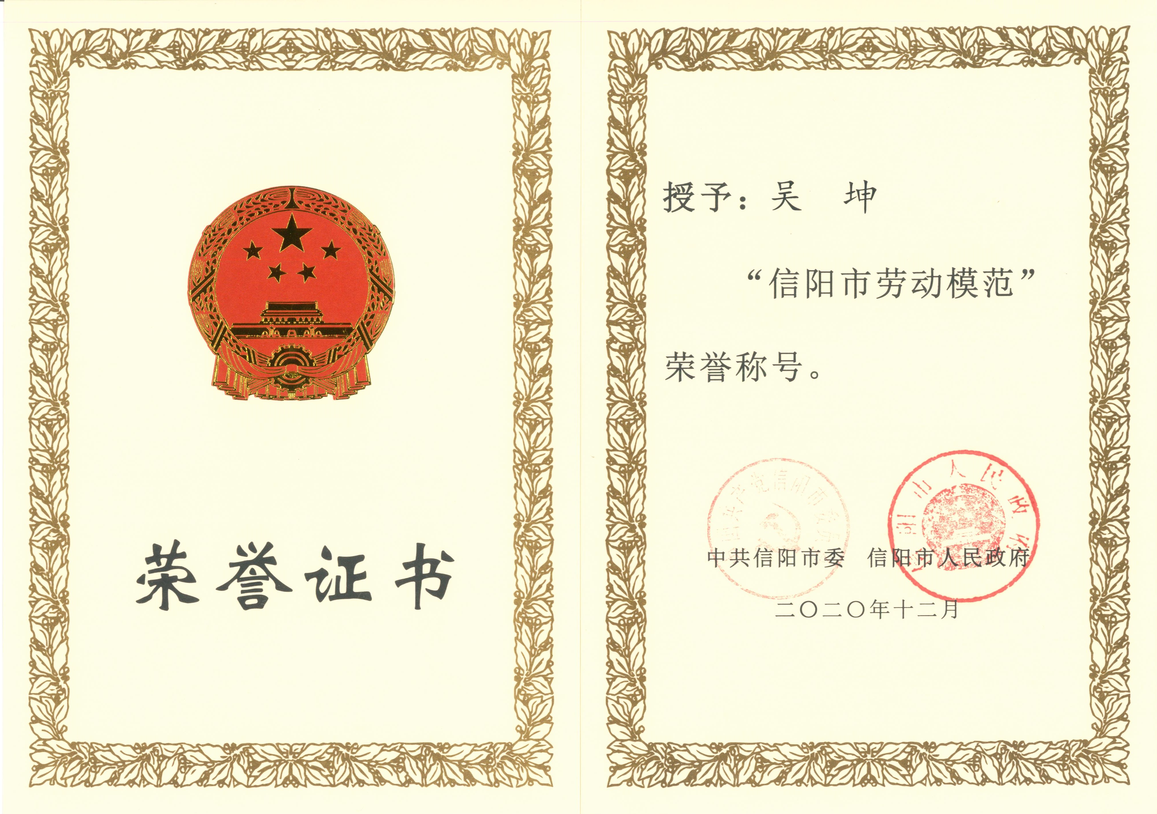 熱烈祝賀吳坤同志榮獲信陽市勞動模范稱號