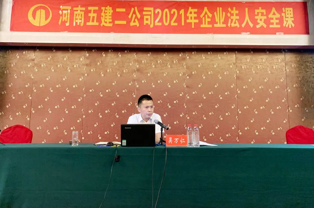 為全面深入開展第20個全國“安全生產(chǎn)月”活動,日前, 河南五建二公司在中樂百花酒店三樓會議廳舉辦了2021年企業(yè)法人安全課,公司董事長、總經(jīng)理吳萬仁以法人代表的身份親自授課。公司董事會、經(jīng)理班子成員、各部門、二級機構(gòu)負(fù)責(zé)人及各項目部項目經(jīng)理、技術(shù)負(fù)責(zé)人、專職安全管理人員等共一百余人參加了課程。